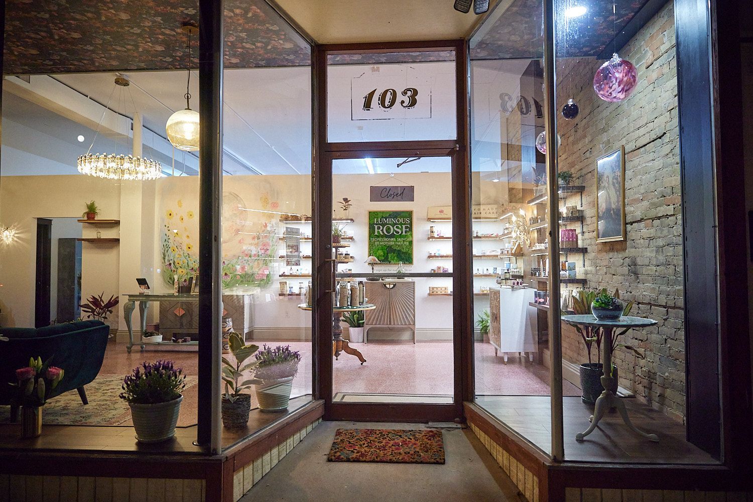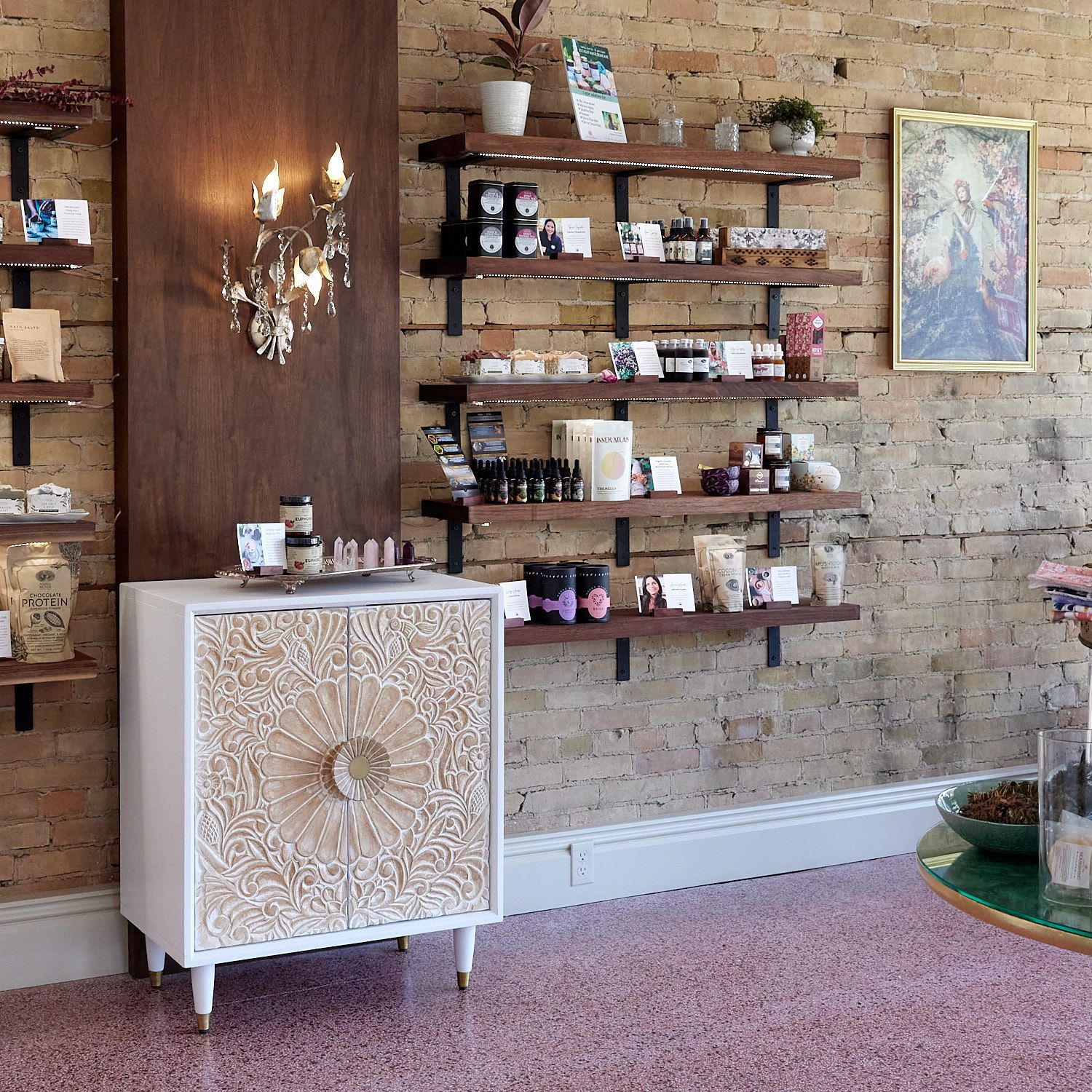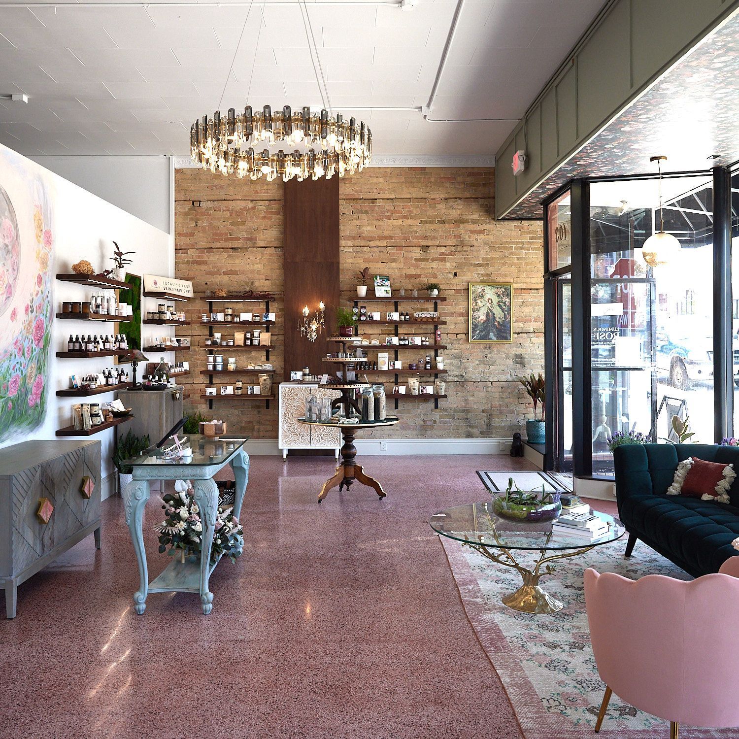 Welcome to the Rose Project, a commercial space with so much to offer! This remodel was a transformative design collaboration between the business owner and Inspired Design Team. The objective was to rejuvenate the existing space into a sophisticated and functional environment that not only serves as a production space for the creation of skincare products but also provides an inviting storefront for clients to experience and purchase the unique offerings. The remodel revealed a couple of delightful surprises, beginning with the removal of drywall, which unexpectedly revealed the original brick walls, adding a touch of historical charm to the space. Further exploration led to the discovery of beautiful, pink terrazzo hidden beneath the flooring, prompting a decision to preserve and showcase this distinctive feature. Together we curated a harmonious blend of modern, vintage, and natural aesthetics, including upcycled elements, which beautifully complimented the overall inviting and stylish boutique atmosphere.
